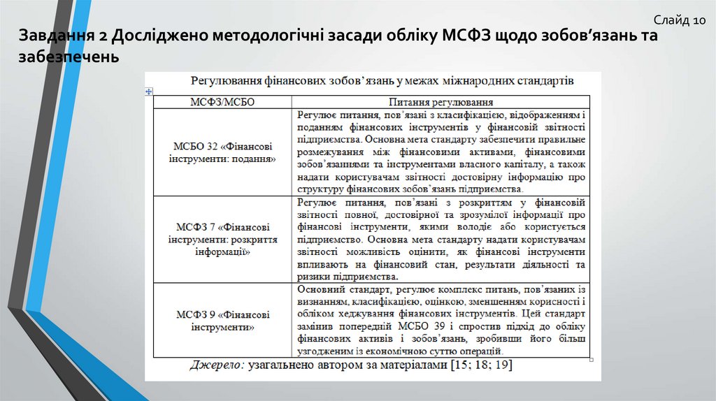 Слайд 10Завдання 2 Досліджено методологічні засади обліку МСФЗ щодо зобов’язань та