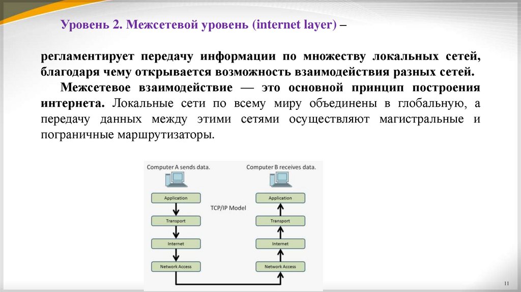 Уровень 2. Межсетевой уровень (internet layer) –регламентирует передачу информации по множеству локальных сетей,