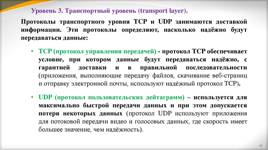 Уровень 3. Транспортный уровень (transport layer).Протоколы транспортного уровня TCP и UDP занимаются доставкой