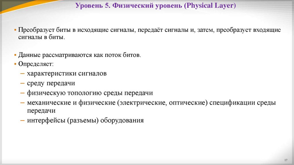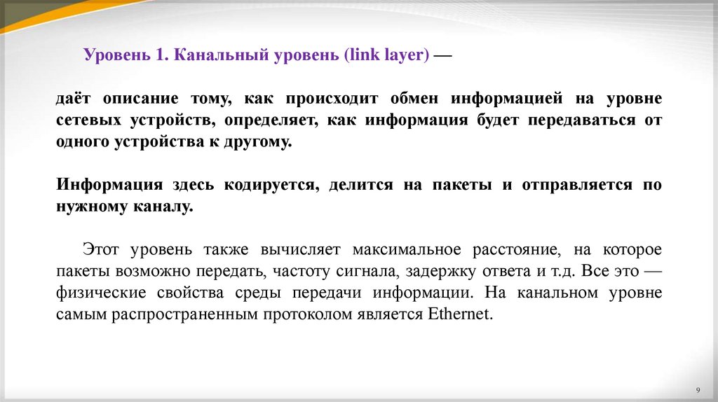 Уровень 1. Канальный уровень (link layer) —даёт описание тому, как происходит обмен информацией на уровне