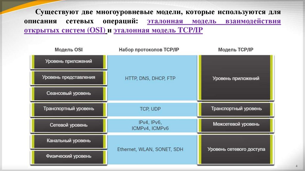 Существуют две многоуровневые модели, которые используются дляописания сетевых операций: эталонная модель взаимодействия