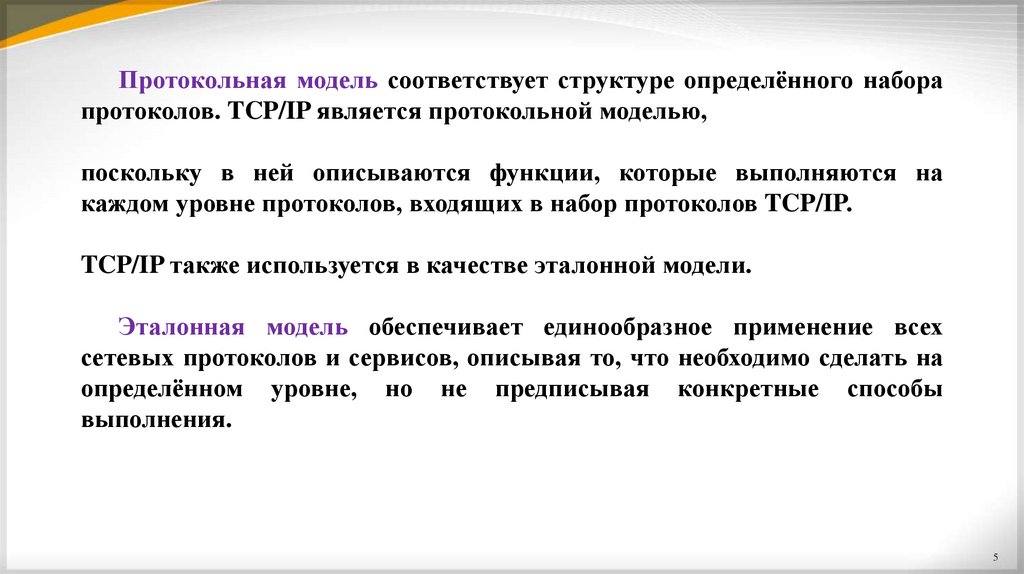 Протокольная модель соответствует структуре определённого наборапротоколов. TCP/IP является протокольной моделью,