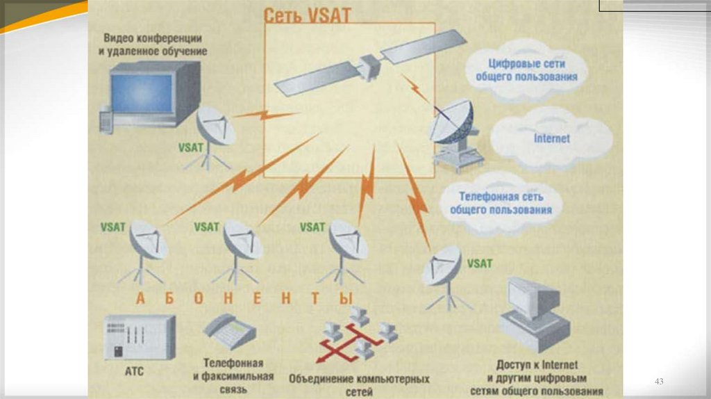 • Организация спутниковой системы:основной недостаток - большое время задержки в канале (270 мс)
