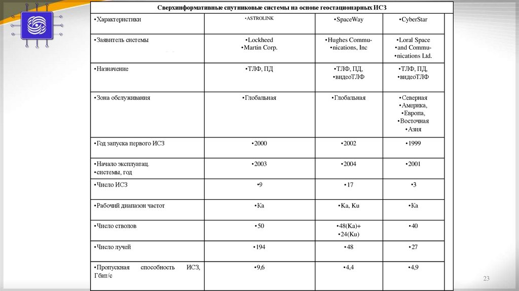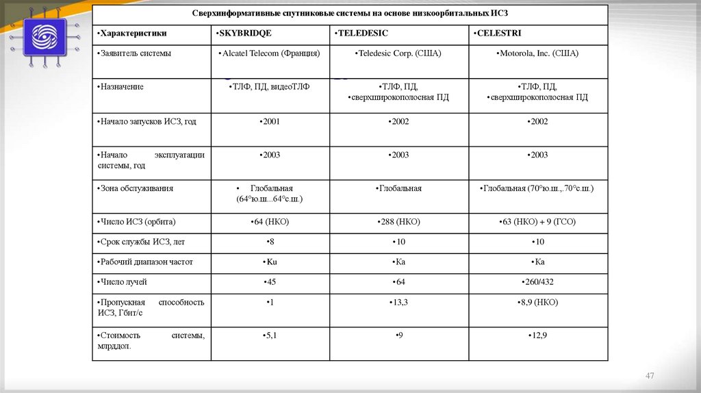 • Практически все заявленные системы будут работать в Кадиапазоне частот (20/30 ГГц)• Наличие межспутниковых радиолиний (60ГГц)
