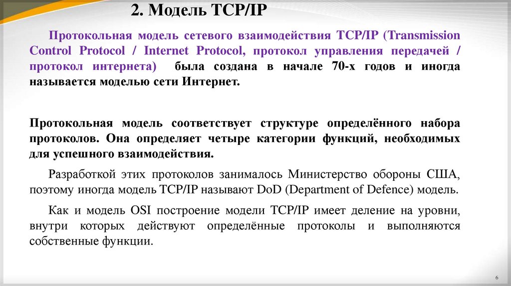 2. Модель TCP/IPПротокольная модель сетевого взаимодействия TCP/IP (Transmission