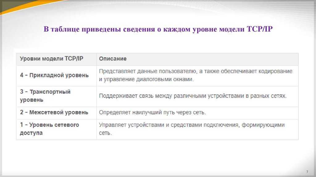 В таблице приведены сведения о каждом уровне модели TCP/IP7