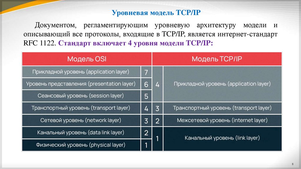 RFC 1122. Стандарт включает 4 уровня модели TCP/IP:
