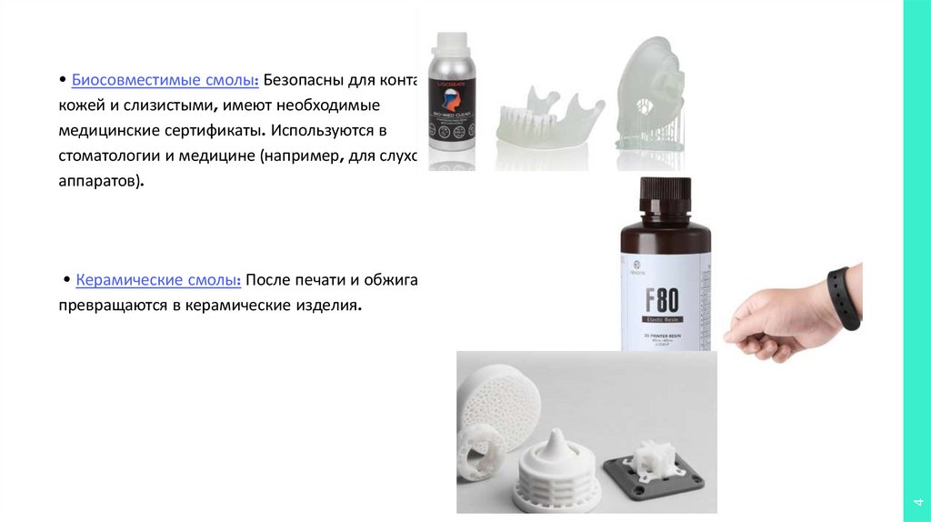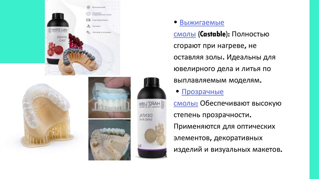 • Биосовместимые смолы: Безопасны для контакта скожей и слизистыми, имеют необходимые