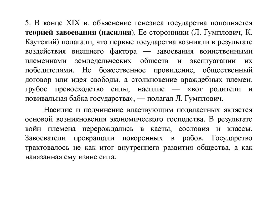 5. В конце XIX в. объяснение генезиса государства пополняетсятеорией завоевания (насилия). Ее сторонники (Л. Гумплович, К.