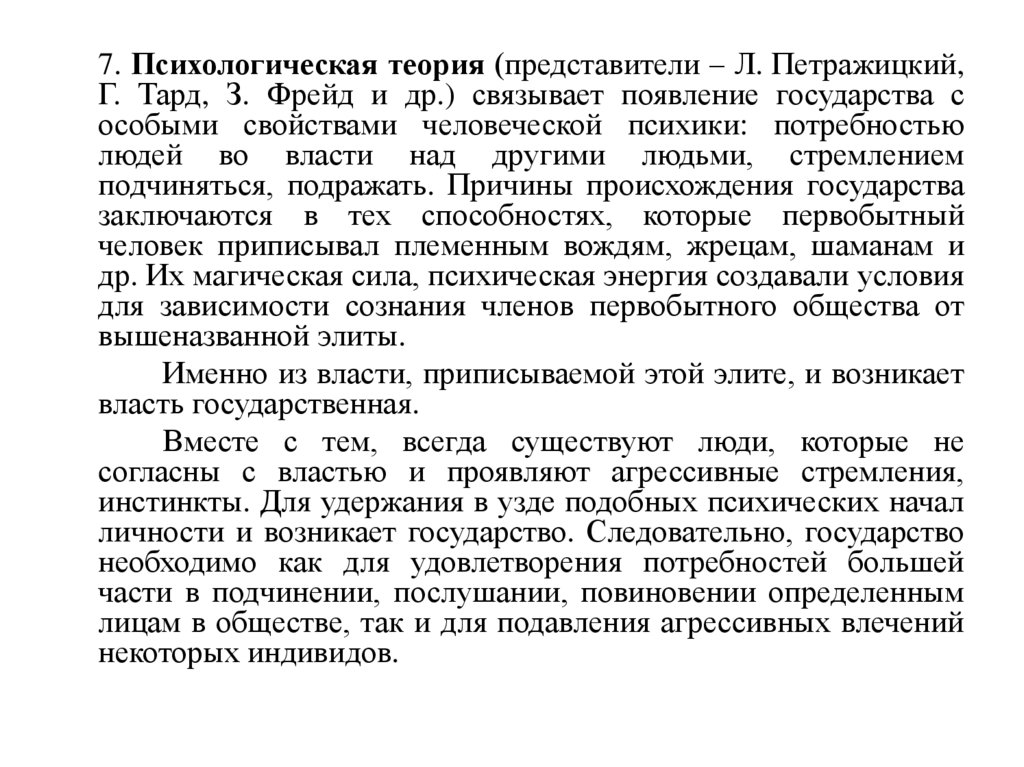 7. Психологическая теория (представители – Л. Петражицкий,Г. Тард, З. Фрейд и др.) связывает появление государства с