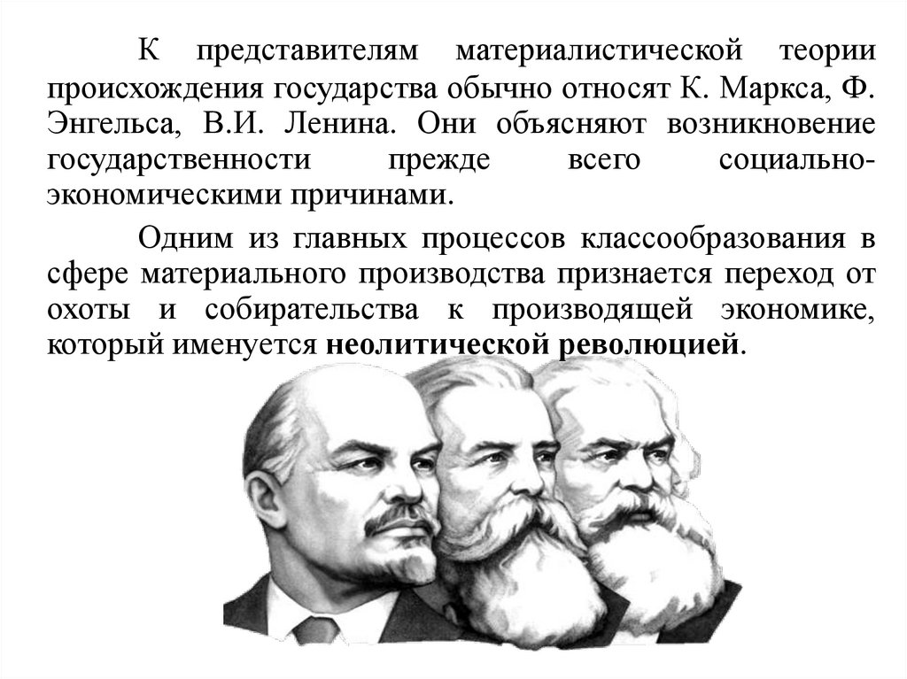 К представителям материалистической теориипроисхождения государства обычно относят К. Маркса, Ф.