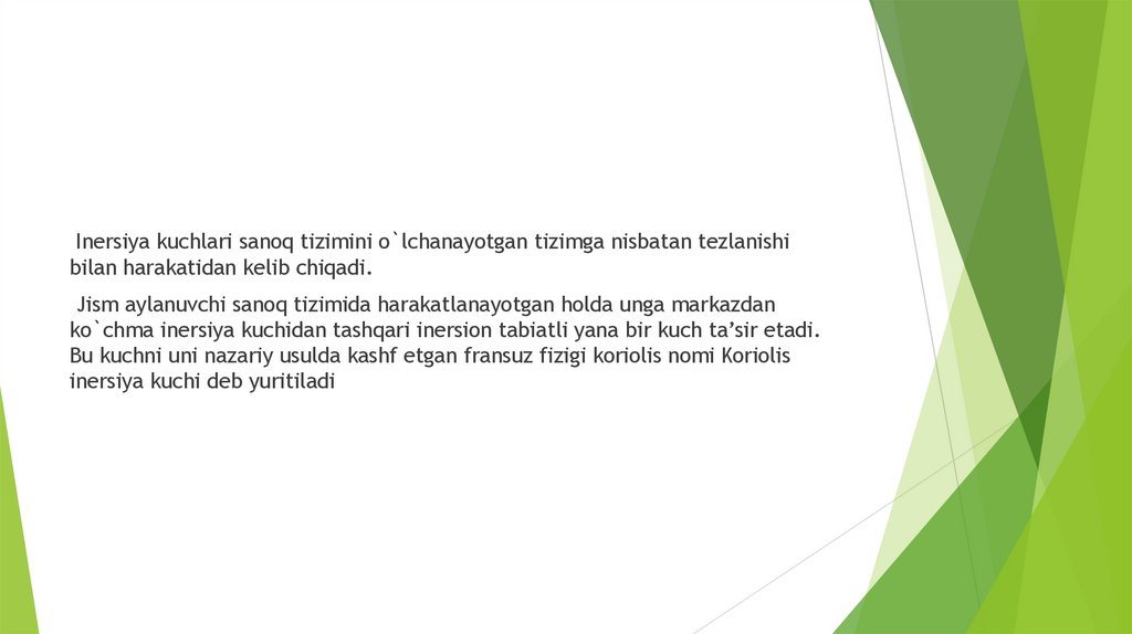 ko`chma inersiya kuchidan tashqari inersion tabiatli yana bir kuch ta’sir etadi.