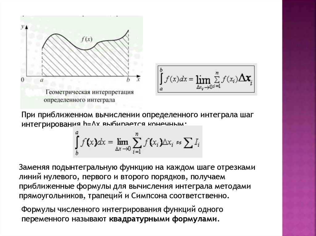 При приближенном вычислении определенного интеграла шагинтегрирования h=∆x выбирается конечным: