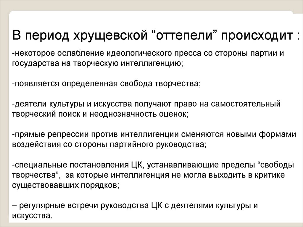 В период хрущевской “оттепели” происходит :-некоторое ослабление идеологического пресса со стороны партии и