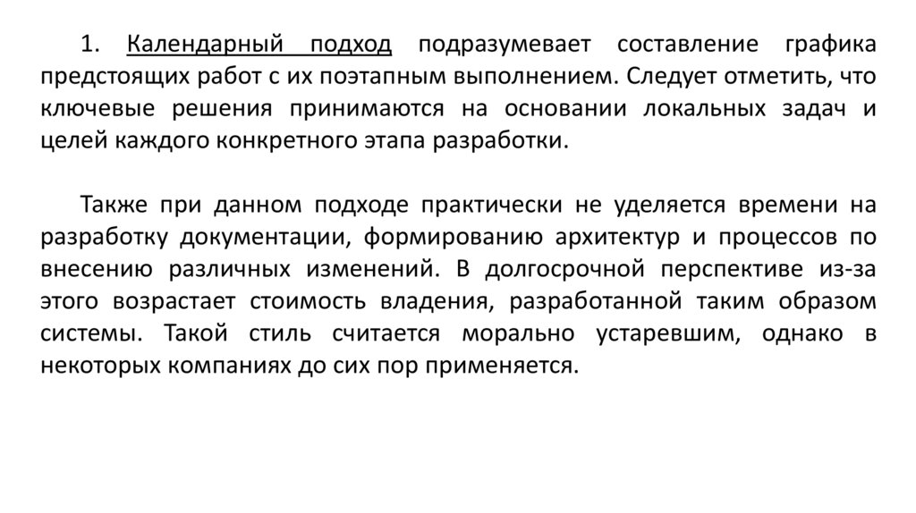1. Календарный подход подразумевает составление графикапредстоящих работ с их поэтапным выполнением. Следует отметить, что