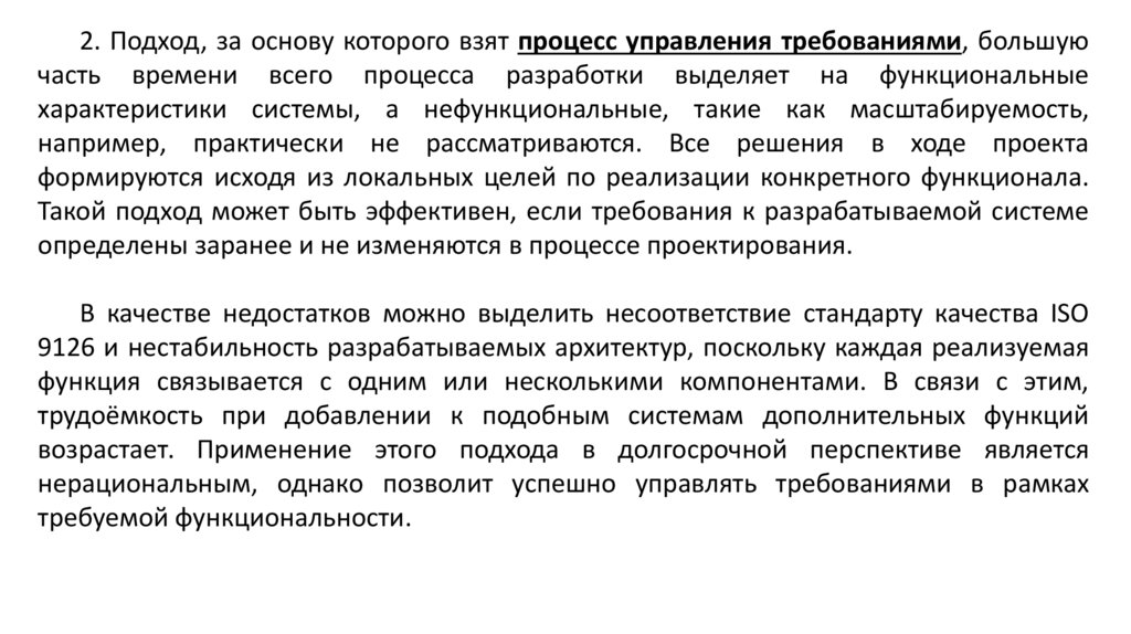 2. Подход, за основу которого взят процесс управления требованиями, большуючасть времени всего процесса разработки выделяет на функциональные
