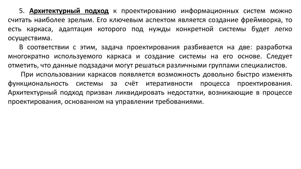 5. Архитектурный подход к проектированию информационных систем можносчитать наиболее зрелым. Его ключевым аспектом является создание фреймворка, то