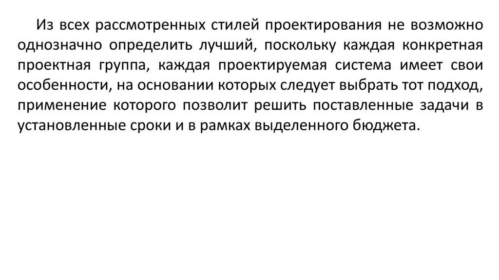Из всех рассмотренных стилей проектирования не возможнооднозначно определить лучший, поскольку каждая конкретная