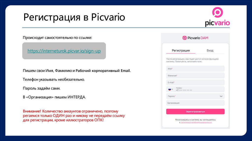 Регистрация в PicvarioПроисходит самостоятельно по ссылке: