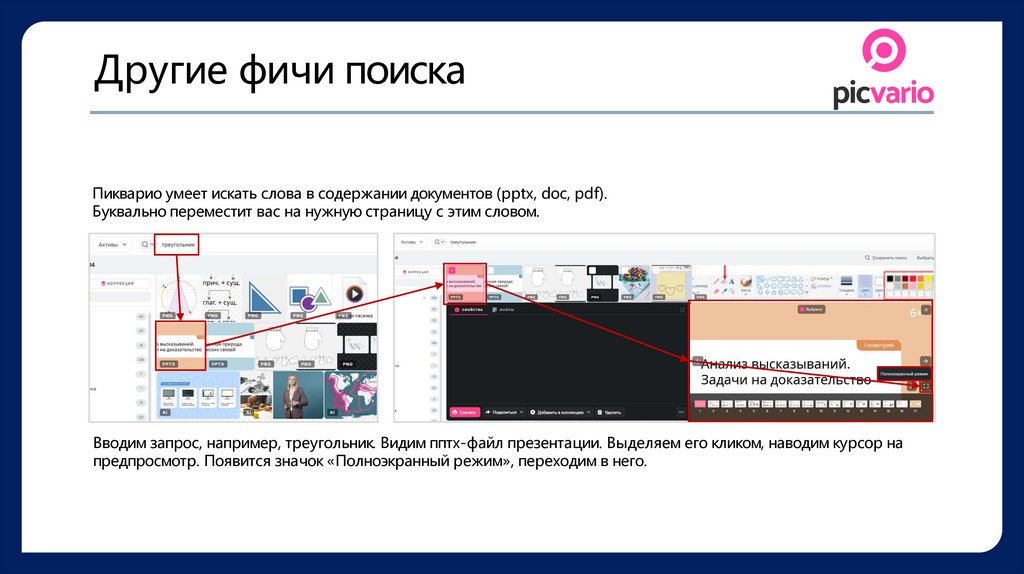 Другие фичи поискаПикварио умеет искать слова в содержании документов (pptx, doc, pdf).