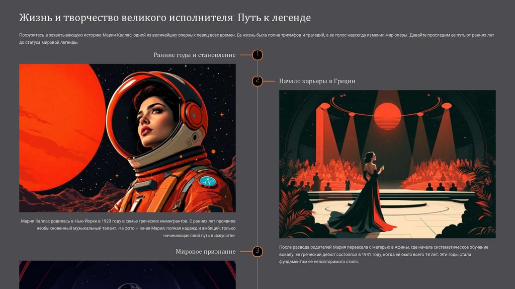 Жизнь и творчество великого исполнителя: Путь к легендеПогрузитесь в захватывающую историю Марии Каллас, одной из величайших оперных певиц всех времен. Ее жизнь была полна триумфов и трагедий, а ее голос навсегда изменил мир оперы. Давайте проследим ее путь от ранних лет