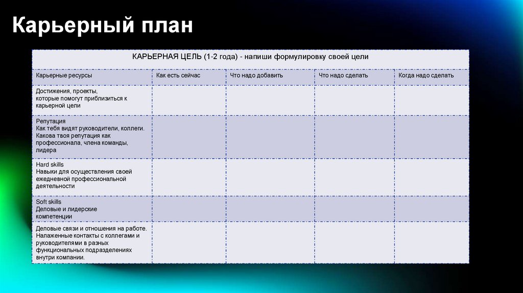 Карьерный планКАРЬЕРНАЯ ЦЕЛЬ (1-2 года) - напиши формулировку своей цели