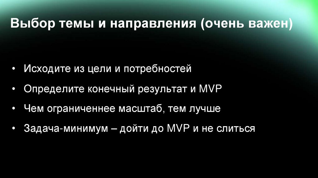 Выбор темы и направления (очень важен)• Исходите из цели и потребностей