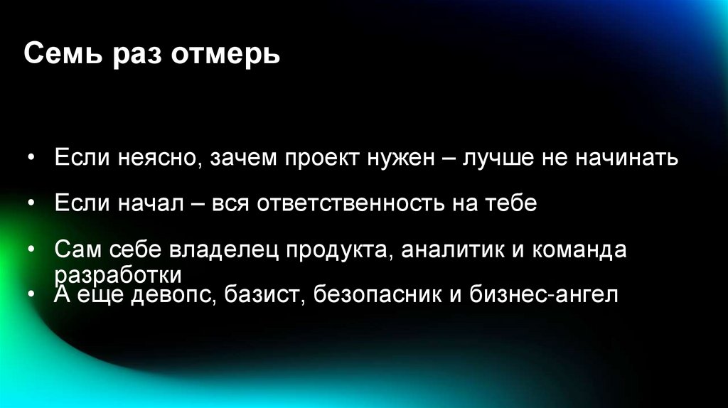 Семь раз отмерь• Если неясно, зачем проект нужен – лучше не начинать