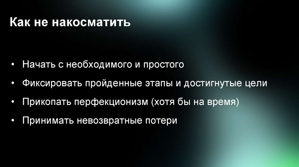 Как не накосматить• Начать с необходимого и простого