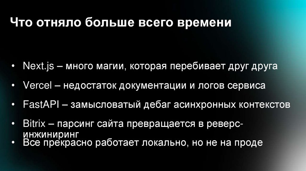 Что отняло больше всего времени• Next.js – много магии, которая перебивает друг друга
