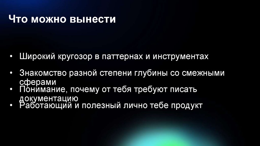 Что можно вынести• Широкий кругозор в паттернах и инструментах