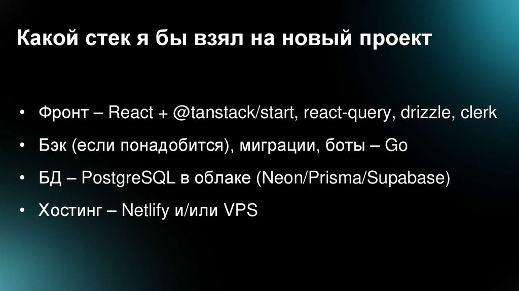 Какой стек я бы взял на новый проект• Фронт – React + @tanstack/start, react-query, drizzle, clerk
