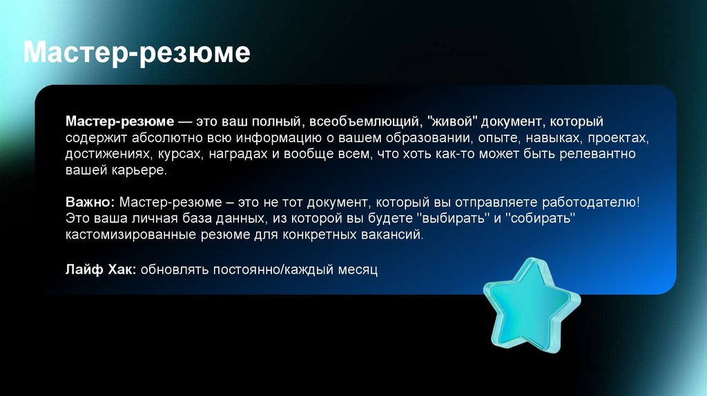 Мастер-резюмеМастер-резюме — это ваш полный, всеобъемлющий, "живой" документ, который