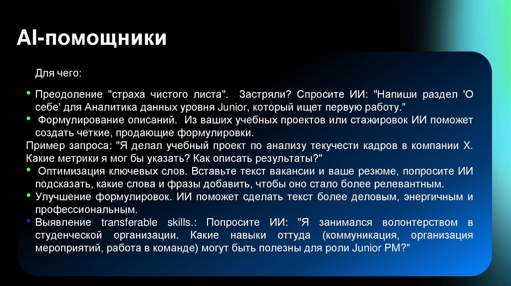• Выявление transferable skills.: Попросите ИИ: "Я занимался волонтерством в