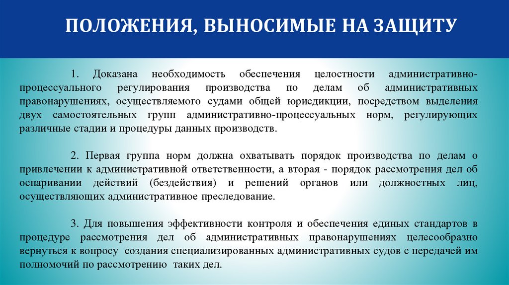 ПОЛОЖЕНИЯ, ВЫНОСИМЫЕ НА ЗАЩИТУ1. Доказана необходимость обеспечения целостности административнопроцессуального регулирования производства по делам об административных