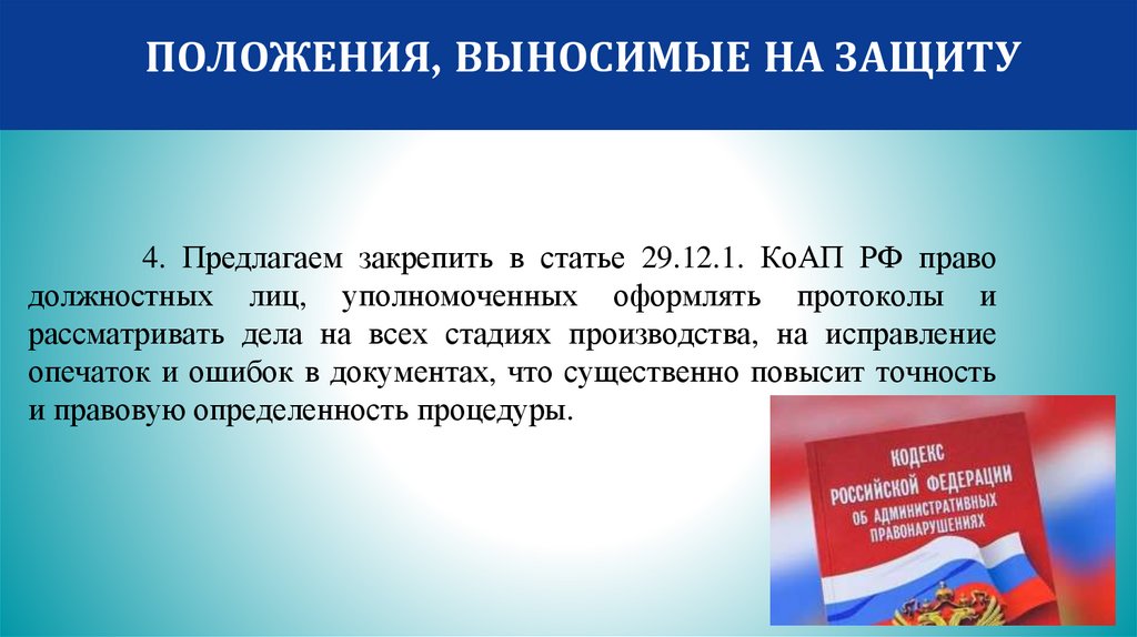 ПОЛОЖЕНИЯ, ВЫНОСИМЫЕ НА ЗАЩИТУ4. Предлагаем закрепить в статье 29.12.1. КоАП РФ право