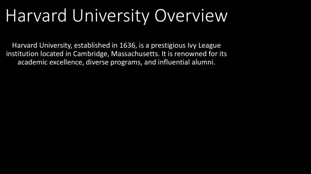 Harvard University, established in 1636, is a prestigious Ivy Leagueinstitution located in Cambridge, Massachusetts. It is renowned for its
