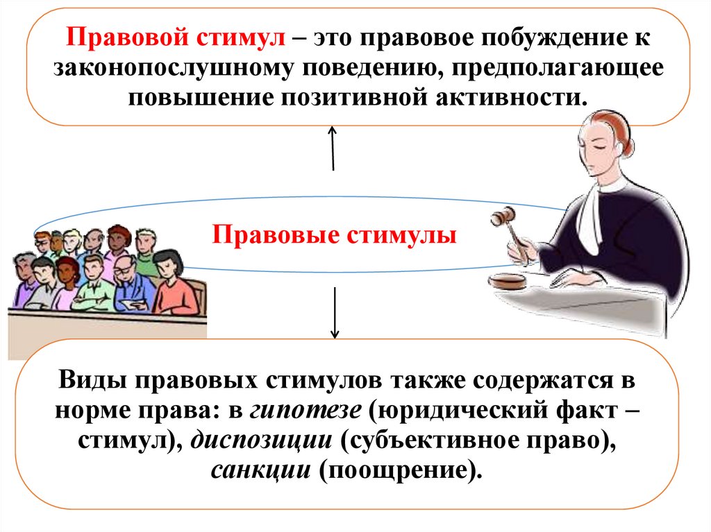 Правовой стимул – это правовое побуждение кзаконопослушному поведению, предполагающее