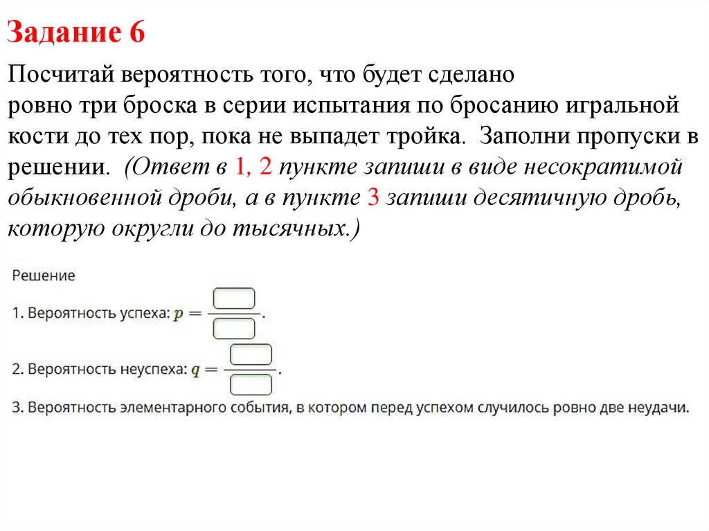 кости до тех пор, пока не выпадет тройка. Заполни пропуски в