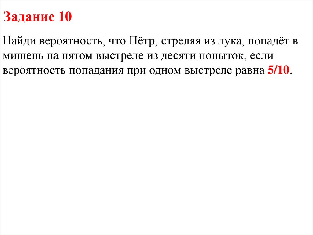 Задание 10Найди вероятность, что Пётр, стреляя из лука, попадёт в
