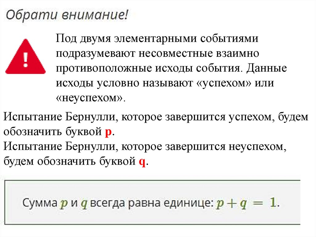а неуспех — это разность успеха от единицы: q=1−p.