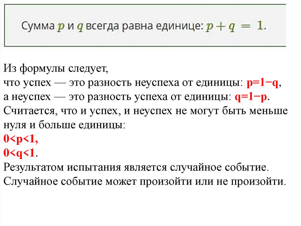 Из формулы следует,что успех — это разность неуспеха от единицы: p=1−q,