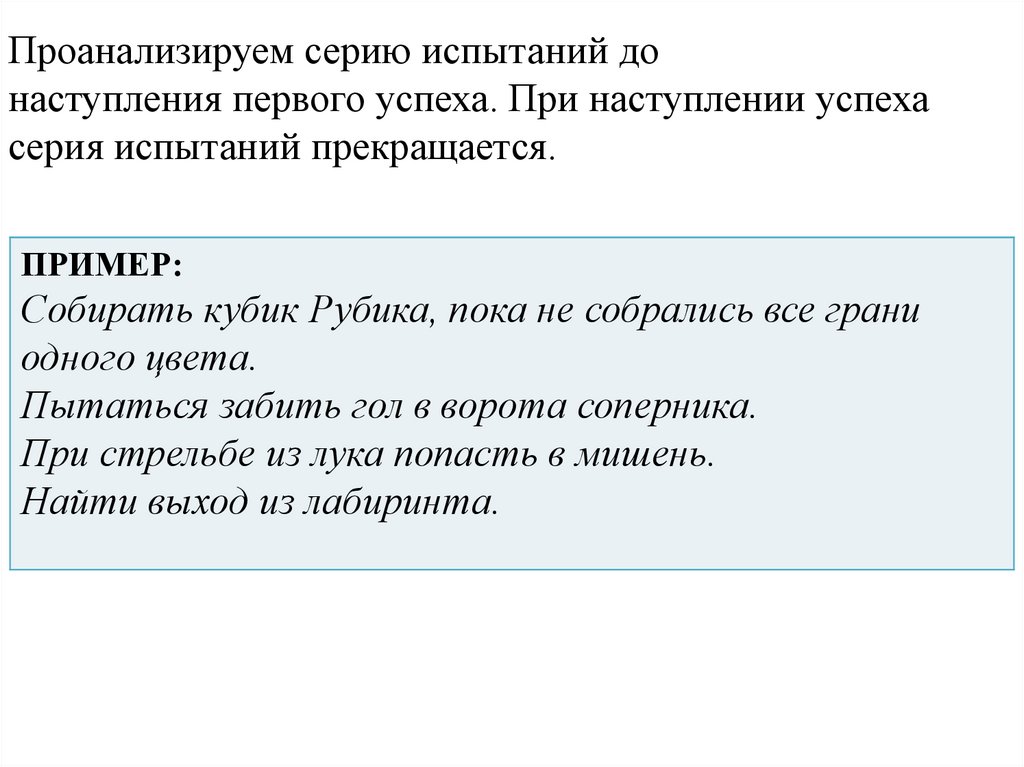 Проанализируем серию испытаний донаступления первого успеха. При наступлении успеха