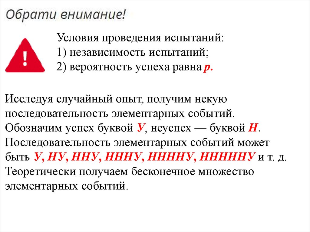 Условия проведения испытаний:1) независимость испытаний;