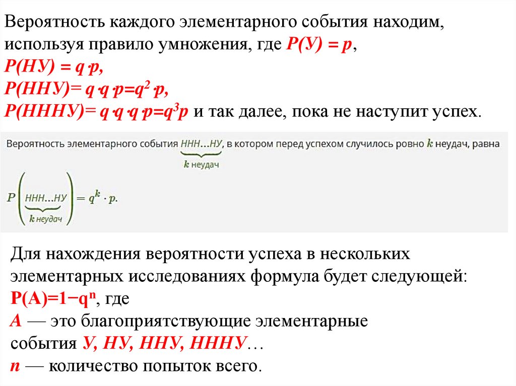 P(НННУ)= q⋅q⋅q⋅p=q3p и так далее, пока не наступит успех.