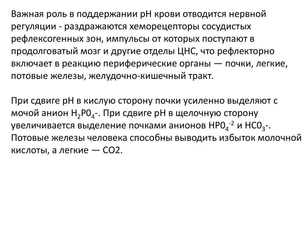 Важная роль в поддержании рН крови отводится нервнойрегуляции - раздражаются хеморецепторы сосудистых