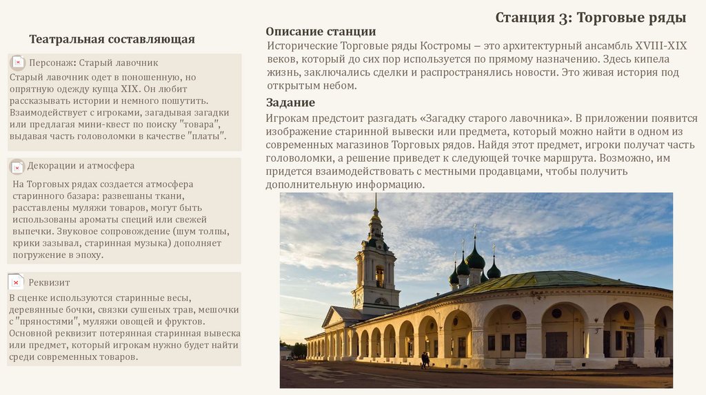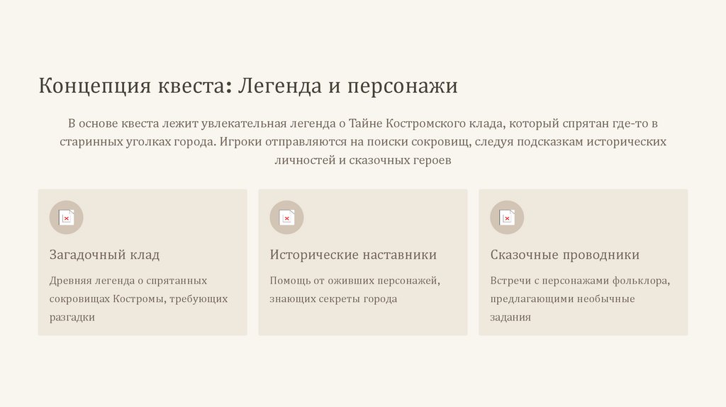Концепция квеста: Легенда и персонажиВ основе квеста лежит увлекательная легенда о Тайне Костромского клада, который спрятан где-то в