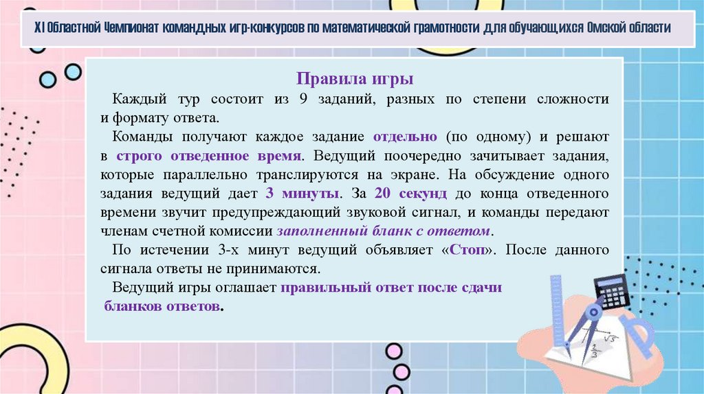 XI Областной Чемпионат командных игр-конкурсов по математической грамотности для обучающихся Омской областиПравила игры