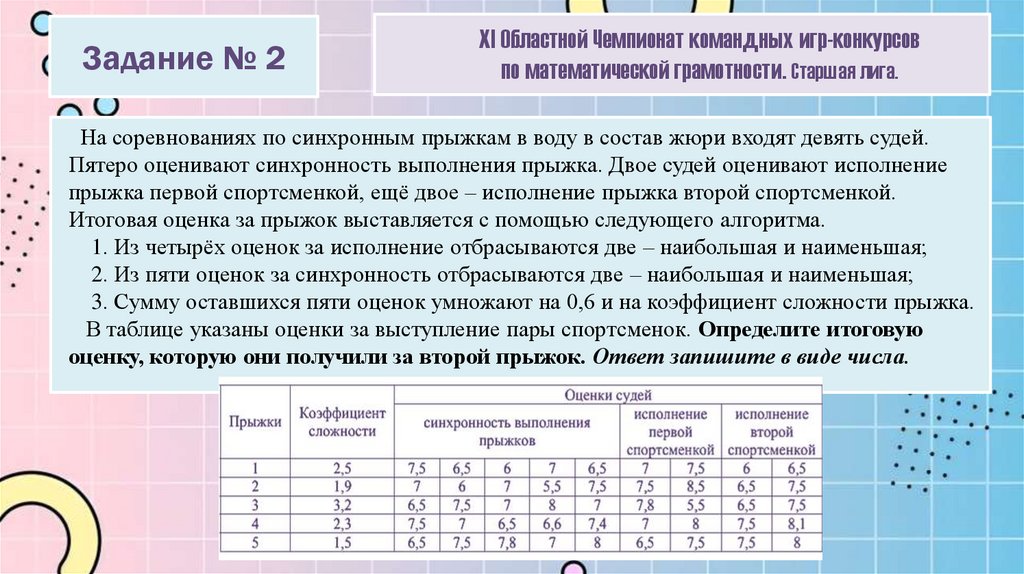 оценку, которую они получили за второй прыжок. Ответ запишите в виде числа.