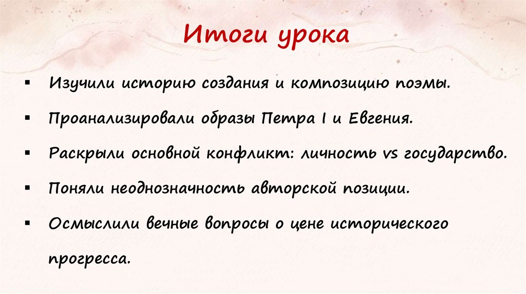 Итоги урокаИзучили историю создания и композицию поэмы.